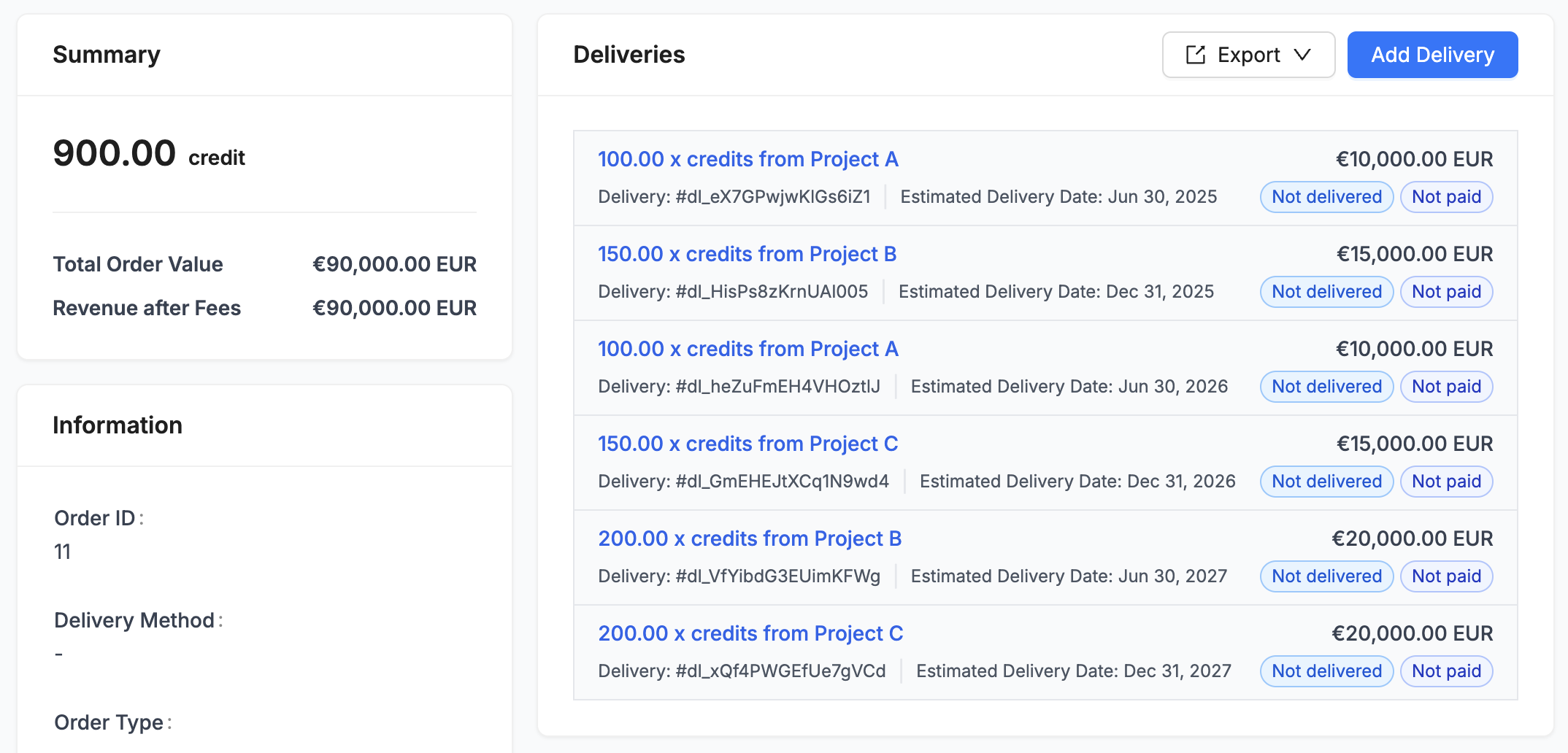 An Order represents a commitment from a Customer to purchase credit units from your projects. Mangrove allows you accurately track orders across all your customers to ensure you have one consolidated view of all the offers and commitments made from the credit inventories of your projects. An Order serves as a container for one or more Deliveries (separate fulfillments of the order) to the customer. Orders can include deliveries from multiple projects, and do not require all deliveries to be made at once. The total quantity of an order is the sum of the committed units across all included deliveries, while the total revenue of an order is the sum of the value of all included deliveries.Recording an order
